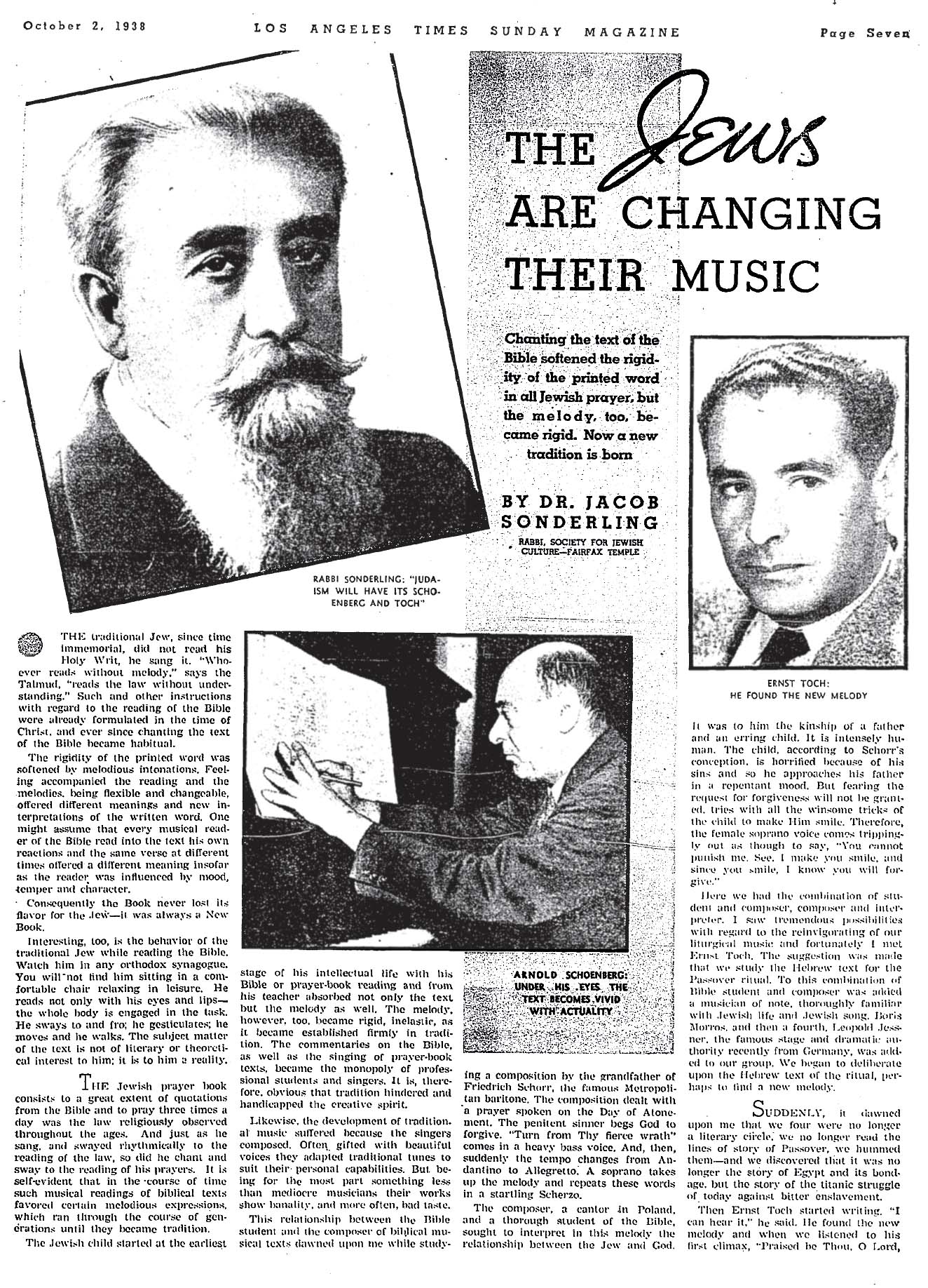 Below, a 1938 Times article by Sonderling on the reinterpretation of Jewish music. According to his obituary, Sonderling was the oldest active Zionist in the United States. He was the leader of Hamburg, Germany’s Reform Temple before he was 30 and came to the U.S. in 1923. He was professor of Jewish thought and homiletics at the California School of Hebrew Union College. He died in 1964 at the age of 86.