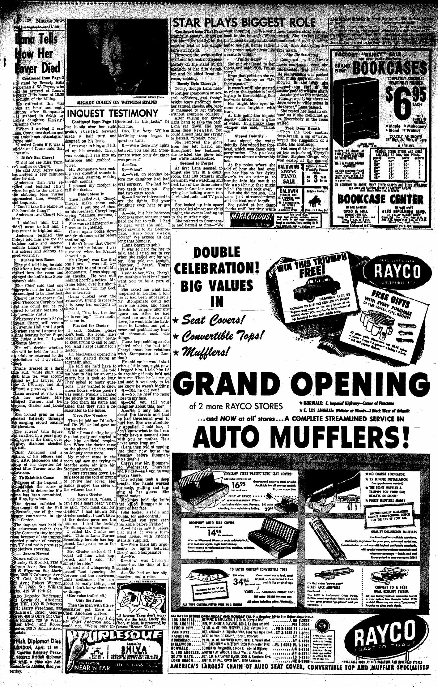 The Mirror published excerpts of the coroner’s inquest in the death of Johnny Stompanato. Several crucial paragraphs about the stabbing are, unfortunately, illegible in my scan of the first runover page. I’ll try to get a lighter image soon. It is evident that, just as Stompanto’s brother, Carmine, alleged, there was some delay in contacting medical personnel and a further delay in dealing with the dispatcher. Lana Turner’s account of her relationship with Stompanto makes him sound brutal and ugly.