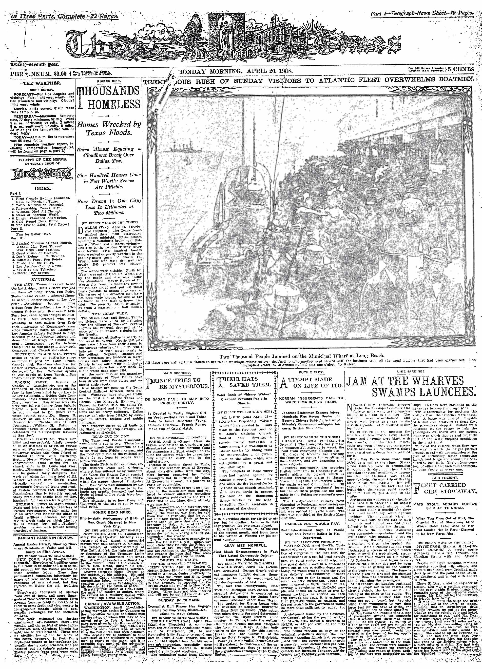 Recall from yesterday that crowds hoping to see the Great White Fleet overwhelmed the city’s transportation systems. Those who managed to get to the wharves at Long Beach, San Pedro, Redondo Beach and Venice overtaxed the ability of boats to take them out to see the ships, The Times said. Even after 5 p.m., when the ships stopped letting visitors aboard, the crowd bought boat tickets merely to a closer look at the fleet. Because it was Easter Sunday in 1908, the fleet’s Rear Adm. Charles M. Thomas, an Episcopalian, attends services at St. Paul’s Pro-Cathedral in Los Angeles and takes Communion at the rail.