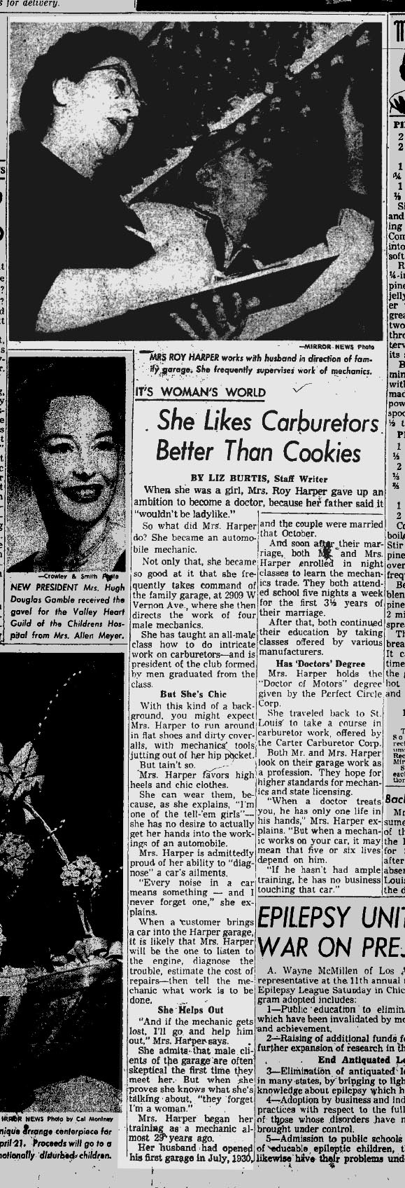 April 20, 1959: Meet Mrs. Roy Harper, a trained auto mechanic who helps run her husband’s auto garage, where she is apparently a service writer and specializes in carburetors. But the Los Angeles Times assures readers that she’s still ladylike and prefers “high heels and chic clothes” to dirty coveralls and tools in the hip pockets.